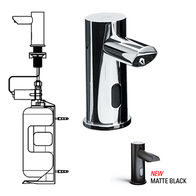 Constructed of chrome plated spout and battery or AC power operated, hands-free sensor housing with a highly polished finish over all surfaces. LED indicates function and battery condition on face front. Translucent tank holds 33.8 oz (1 L) of liquid soap.