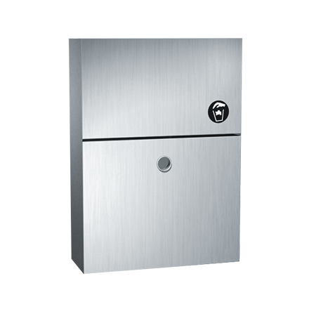 Self-closing door is mounted to cabinet with stainless steel spring hinge. Holds 1.5 gal (5.7liters) of dry/solids waste