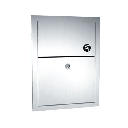 Self-closing door is mounted to cabinet with stainless steel spring hinge. Recessed for side wall installation. Holds 1.5 gal (5.7 liters) of dry solids.