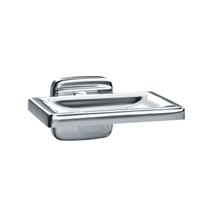 Drawn, one-piece stainless steel soap dish welded to support arm and flange. Has two drain holes and two ridges to support bar of soap.