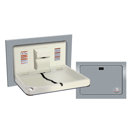 This horizontal station has a door facing and collar made from 18 gauge 304 stainless steel. Fabricated of FDA-approved fungus and bacteria-resistant plastic. Unit complies with 2010 ADA Accessibility Standards and supports a static load of 300 lbs. (136 kg) and be tested in excess of 350 lbs (159 kg).